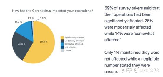 2020年4月,航运和货运资源公司对全球300名物流专业人士进行了一项调查,结果发现,近60%的受访者表示,他们的业务受到了“显著影响”。另有25%的人说他们“受到了中度影响”,另有14%的人“受到了一定程度的影响”。